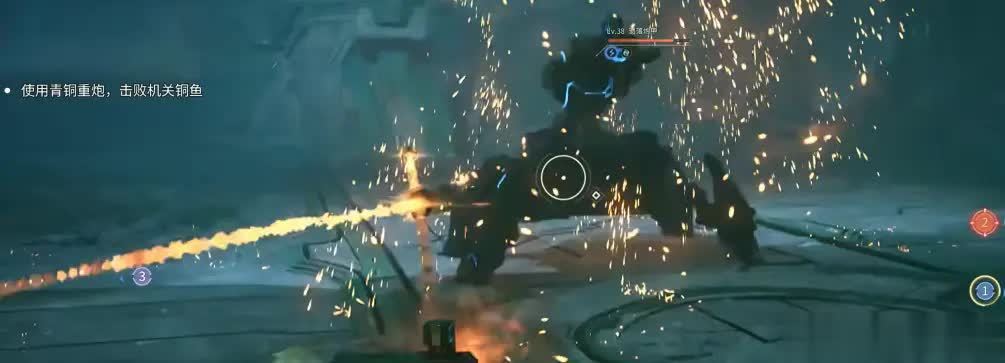 BOSS1机关铜鱼,纯机制BOSS,击破释放电流干扰炮台的遗落炮甲,所有玩家登上炮台,攻击铜鱼破韧,铜鱼掉下来之后下炮台集火输出反复即可击杀,